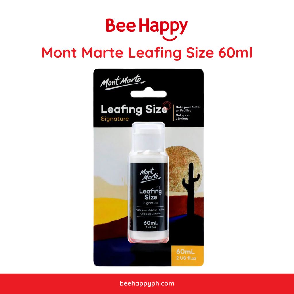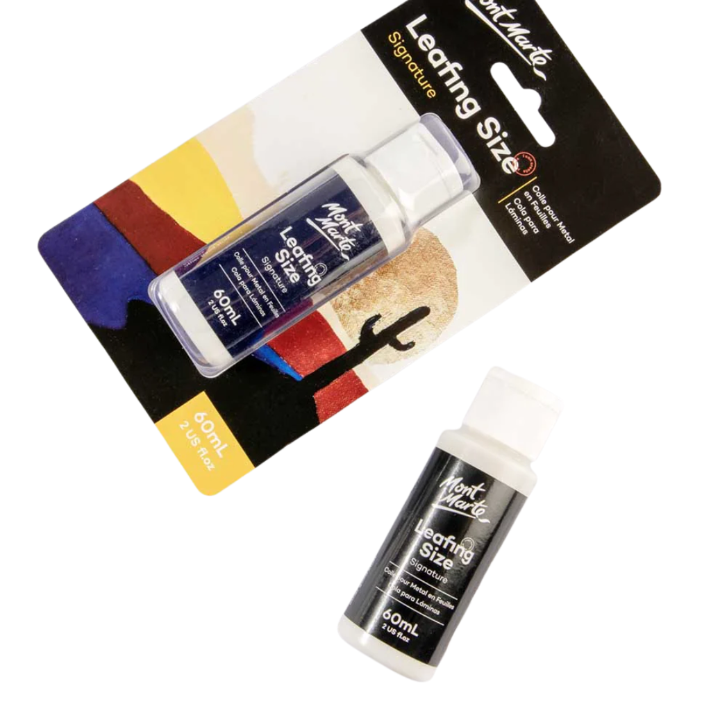 Mont Marte Leafing Size is a non toxic, water based gilding adhesive. The adhesive stays open where extended tack time is required, it dries to a translucent finish and cleans up in water. It can be used straight from the bottle with no dilution on porous and non porous surfaces, including: wood, plaster, glass, metal, leather and canvas. Proper tack will develop in 25mins at normal humidity and it will stay open for 24hrs.
