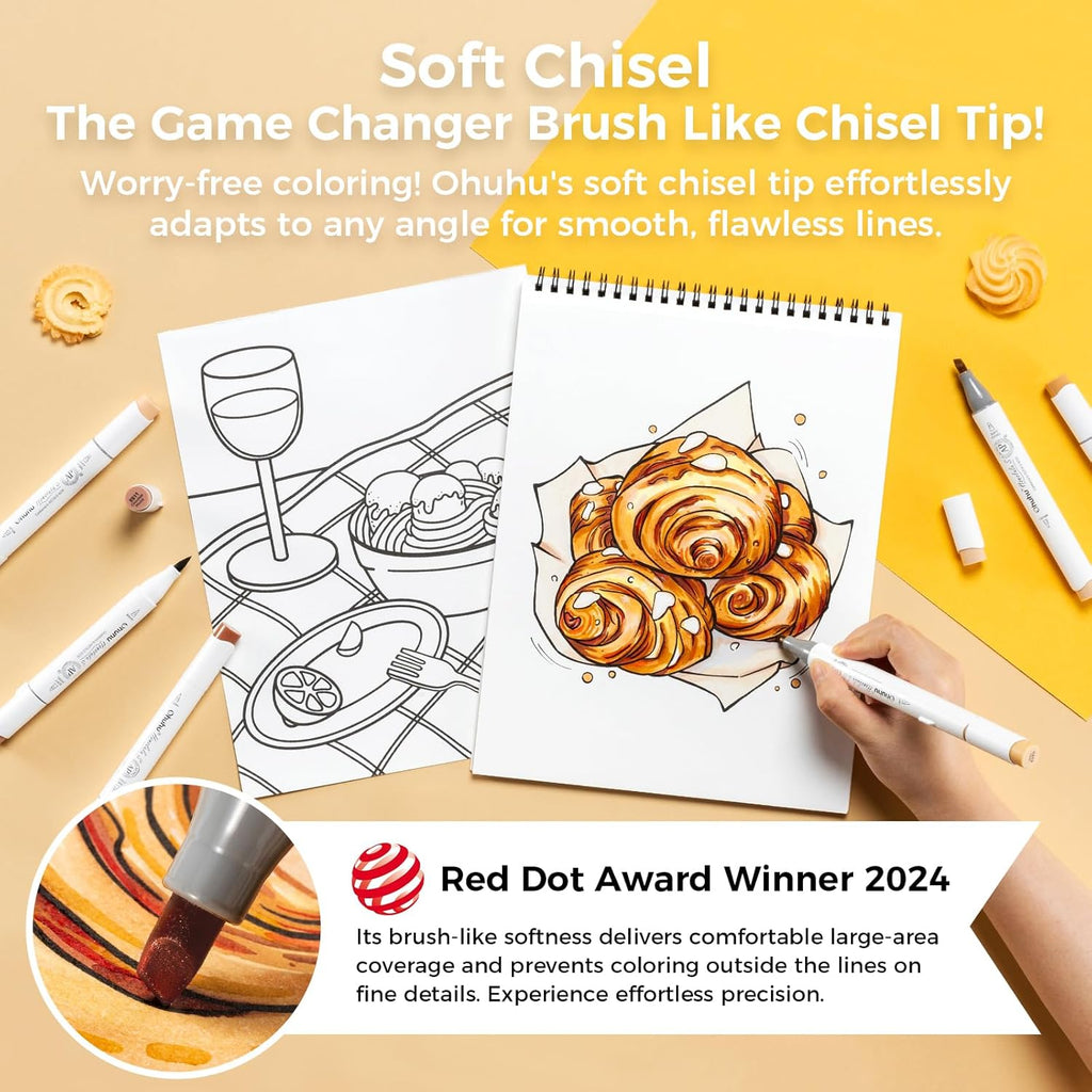 - BRUSH & SOFT CHISEL, DOUBLE THE TIP, DOUBLE THE FUN: Enjoy coloring, drawing with Ohuhu Dual Tip Alcohol Markers. The flexible 1–6 mm brush tip is perfect for bold, sweeping strokes and calligraphy, while the 1–4 mm soft chisel tip gives you precision for detailed work. And now, with Ohuhu replacement brush tips available, you can easily swap out worn tips to keep your markers performing like new. Consistent lines, vibrant colors—the only limit is your imagination.